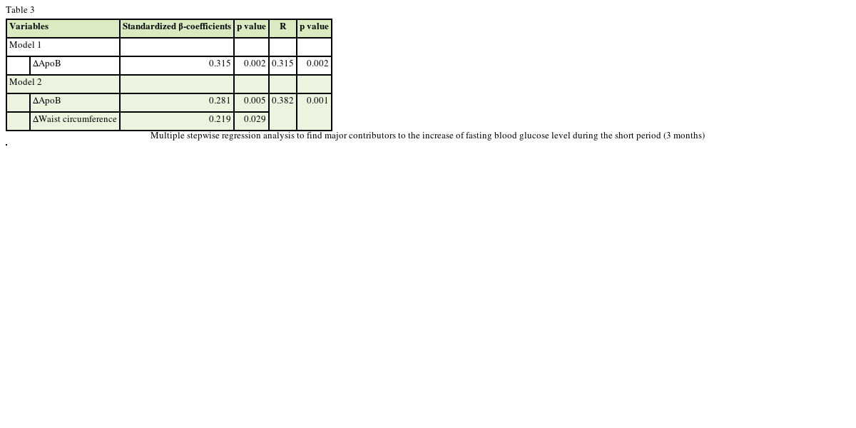 Table 3Multiple stepwise regression analysis to find major contributors to the increase of fasting blood glucose level during the short period (3 months)