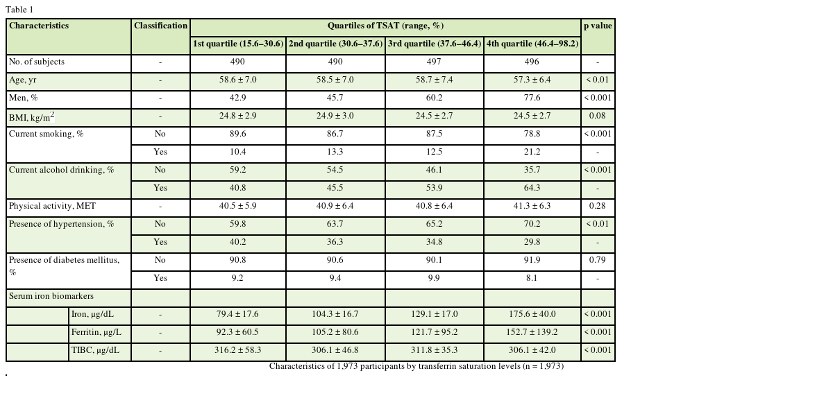 13]. The study participants were 2,347 Korean aged 49–79 years who completed the follow-up interview of the cohort study between February 2011 and November 2012 and provided blood samples for assays of iron status biomarkers. In the questionnaire-based interview, they provided informationon socio-demographics, lifestyle factors, health status, and medical history. They singed an informed consent form approved by the Human Subjects Review Committee at the Korea University Ansan Hospital. After excluding participants who reported diagnosis of cancer, diabetes mellitus, and hypertension or who showed iron deficiency (TSAT levels < 15%) or who had missing values of lifestyle factors were excluded. Finally, 1,973 participants were remained for the analysis.