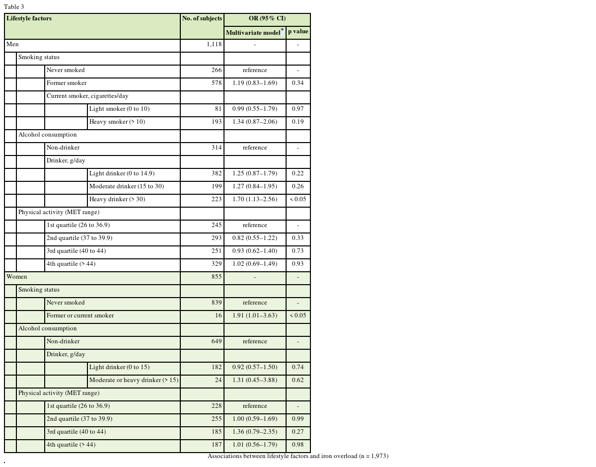 The strengths of our study include a large sample size, investigation in a general population, consideration of a variety of lifestyle factors, and presentation of joint effects of lifestyle factors in the association with iron overload. Study limitations should be taken into account for the interpretation of our findings. Because the study design was cross-sectional, a causal relationship remains unclear. Because the findings may be generalizable to middle-aged and older Asians, further studies for other age groups or other ethnicities are warranted.
