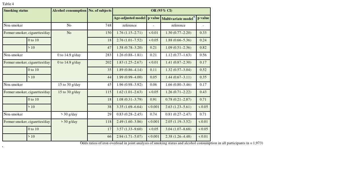 In a population-based cross-sectional study, we observed positive associations of alcohol consumption and smoking status with iron overload. In particular, the association for alcohol consumption was significant only among men while that for smoking was only among women. In addition, heavy smokers were more likely to have iron overload even if they had moderate alcohol consumption with 15 to 30 g/day. Heavy alcohol drinkers with > 30 g/day were more likely to have iron overload even if they were former smokers or moderate smokers with < 10 cigarettes/day.