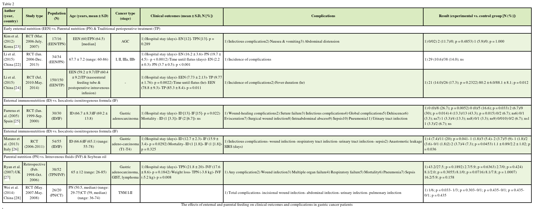 The effects of enternal immune-enriched diet (ID) and control formula were compared postoperatively (Table 2). Surgical patients given with ID (e.g., formula supplemented with arginine, omega-3 fatty acids and RNA) had significantly shorter hospital stay (13/15 days, p = 0.02) and fewer postoperative complications, such as suture failure (N = 0 [0%]/5 [16.6%], p = 0.03), and wound-healing (N = 0 [0%]/8 [26.7%], p = 0.005), infectious (N = 2 [6.7%]/9 [30%], p = 0.01) and global complications (N = 4 [13.3%]/13 [43.3%], p = 0.01) compared to a group given with isocaloric-isonitrogenous formula [25]. These findings were also similar to other study in hospital stay (e.g., shortened hospital stay (12.7 [± 2.3]/15.9 [± 3.4] days, p = 0.029) and duration of SIRS (1.1 [± 0.89]/2.2 [± 1.02] days, p = 0.036), and fewer infectious complications (N = 4 [7.4%]/11 [20%], p = 0.041), such as wound (N = 1 [1.8%]/3 [5.4%]), respiratory tract (N = 2 [3.7%]/5 [9%]), and urinary tract infection (N = 1 [1.8%]/2 [3.6%]), sepsis (N = 0 [0%]/1 [1.8%]), and anastomotic leakage (N = 2 [3.7%]/4 [7.3%], p = 0.045) [26]. However, both nutritional intervention groups did not show significant differences in mortality.