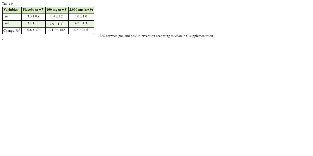 Table 6). However, The FSS was significantly decreased (pre-intervention: 2.9 ± 1.3; post-intervention: 3.4 ± 1.2) within 100 mg of vitamin C supplement group (p < 0.050).