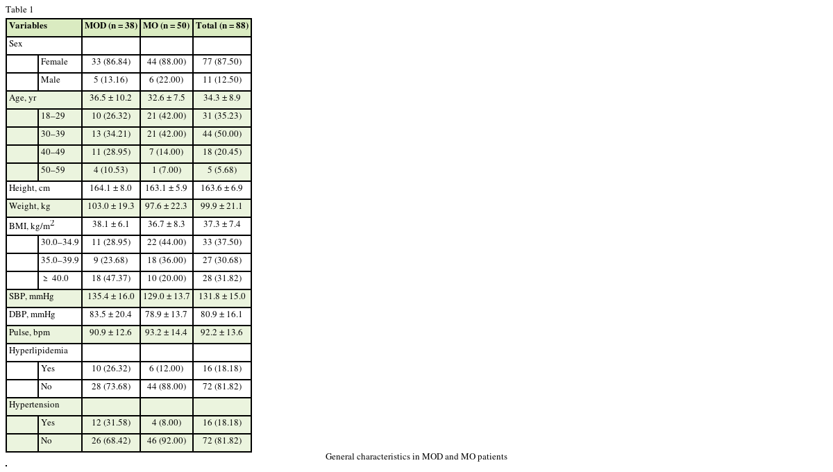 General characteristics of the MOD and MO groups are summarized in Table 1. In the MOD group, 5 males and 33 females participated; and in the MO group, 6 males and 44 females participated. There were no differences between the 2 groups in weight, height, BMI, and blood pressure. However, severe obese patients with a BMI over 40 in the MOD group were more than those in the MO group. In the MOD group, 10 and 12 subjects had hyperlipidemia and hypertension, respectively; and in the MO group, 6 and 4 subjects had hyperlipidemia and hypertension, respectively. Thus, patients with hyperlipidemia and hypertension were more frequently found in the MOD group.