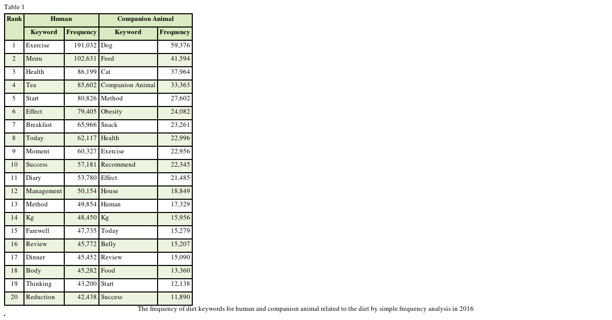 Table 1. The keywords associated with diets for human were shown in order of ‘exercise’ (n = 191,032), ‘eating’ (n = 102,631) and ‘health’ (n = 86,199). The keywords associated with diets for companion animals were shown in order of ‘dog’ (n = 41,629), ‘feed’ (n = 31,068) and ‘cat’ (n = 30,476).