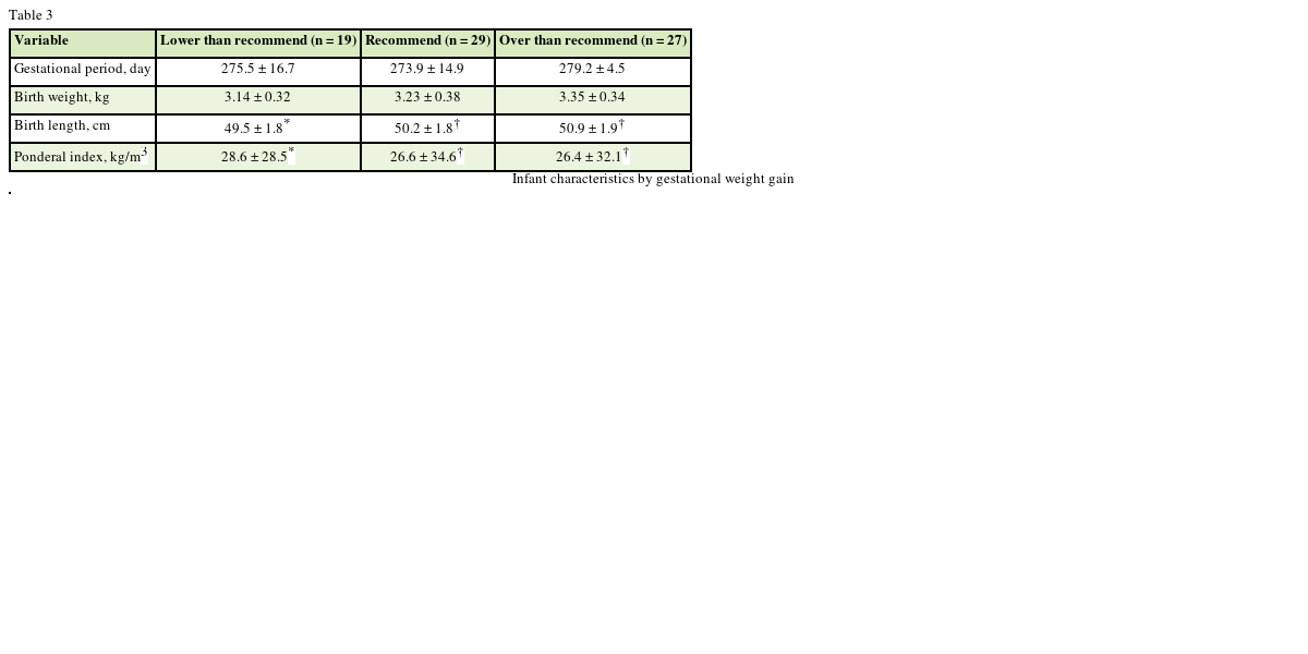Seventy-five women (aged 25–40 years) giving birth to term infants at 2 months postpartum were recruited as part of a community-based residing in Daegu. None of the women studied reported consuming alcohol and cigarettes at any time during their pregnancy. Women completed a demographic questionnaire. Information was obtained on maternal age and self-reported height and pre-pregnancy weights, education level and household income. Weight at birth (kg), length at birth (cm), ponderal index (kg/m