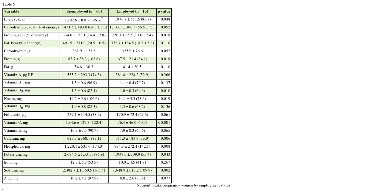 The objective of this study was to investigate the association of nutrient intake and pregnancy outcome mediated by weight gain during pregnancy, job status, and household income. Maternal age, educational level, self-reported pre-pregnancy weights, educational level, and household income were collected from the women at 2 months postpartum. For each offspring, weight at birth, length at birth, and gestational age were collected. Participants were asked to report the frequency of consumption of foods between 28–42 weeks into the pregnancy. Diet was assessed by using a validated 106-item semi-quantitative food-frequency questionnaire (SQFFQ) and women were asked portions and quantities based on pictures, food models, and measuring tools such as cups or teaspoons. Results showed that women who gained below the recommended weight gain during pregnancy, within, and over were 25.3%, 38.7%, 36.0%, respectively. In comparison to weight gain and the offspring's length and weight at birth, the offspring of mothers with a lower weight gain had a higher length. Energy, protein, vitamin B2, vitamin C, calcium, and potassium were significantly lower at employed group. We did not observe a significant difference between birth characteristics and maternal nutrient intake by income. Infants with a higher ponderal index at birth were born to women with a higher pre-pregnancy body mass index (BMI).