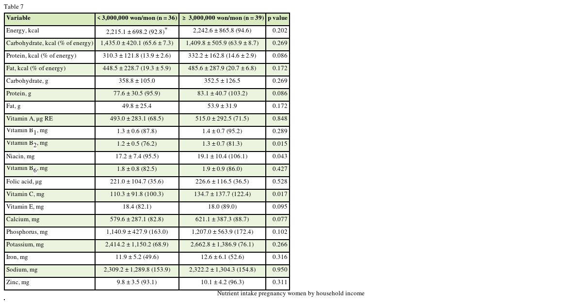 39]. The participants in the present study did not meet KDRIs for many important micronutrients, such as folic acid, iron, calcium, and potassium. Also, vitamin D data were not available, it is very important nutrient with vitamin C and protein for bone health. Adequate folic acid and iron intake during pregnancy is critical for maternal and fetal health [