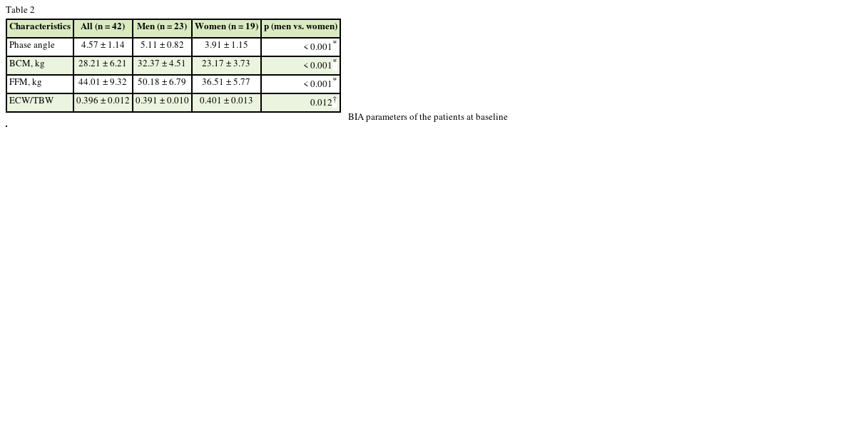 In particular, this study assessed the patient's body composition by BIA. BIA has become widely known as a nutritional assessment tool that can be used to analyze the body composition and body water in a simple, objective, painless, and non-invasive way and at a low cost [