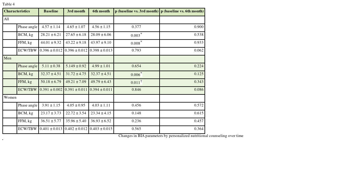 3], this study used multi-frequency impedance by measuring 5 different frequencies. Among BIA measurements, the phase angle is a factor that reflects cell integrity and is related to the nutritional status and the survival rate [