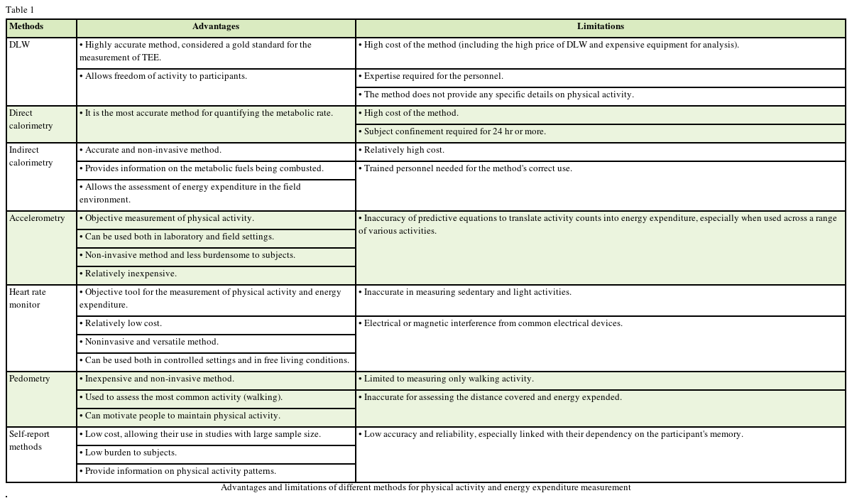 Various methods exist for assessing physical activity and energy expenditure, and each of them has advantages and limitations as summarized in Table 1 [6]. Understanding of these methods is important to decide which method to use for the specific study context. The purpose of this review was to discuss the components of TEE and present different methods of physical activity and energy expenditure assessment, with emphasis on each method's advantages and limitations.