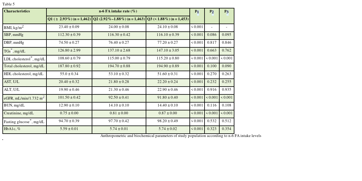Table 5 Anthropometric and biochemical parameters of study population according to n-6 FA intake levels