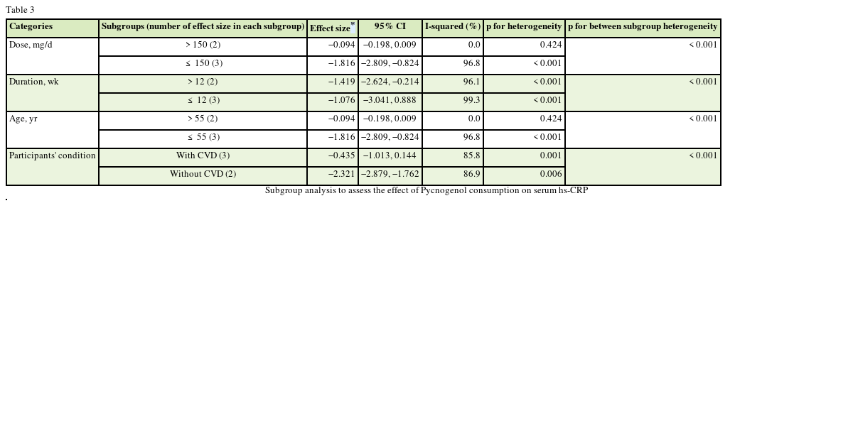 This meta-analysis had the following several limitations: limited eligible clinical trials for assessing the effects of Pycnogenol on CRP; different doses of Pycnogenol and different duration of treatment periods; some of the included trials were not randomized or blinded; and the supplementation was conducted on different diseases. Unavailability of adjustment for potential confounders in some of the study analyse and no investigation for dietary intake in participants during follow-up could have potentially affected the findings of the included studies. Moreover, high heterogeneity of the results can be attributed to duration of intervention, study design, dosage of supplement, type of CRP marker, and participant's conditions in various studies. In order to recognize the source of heterogeneity, we performed various subgroup analysis. The results of subgroup analysis revealed that the heterogeneity was attenuated in dosage and age above 150 mg/d and 55 years, respectively. However, due to the high heterogeneity of our results, interpretation of these results should be cautiously under taken.