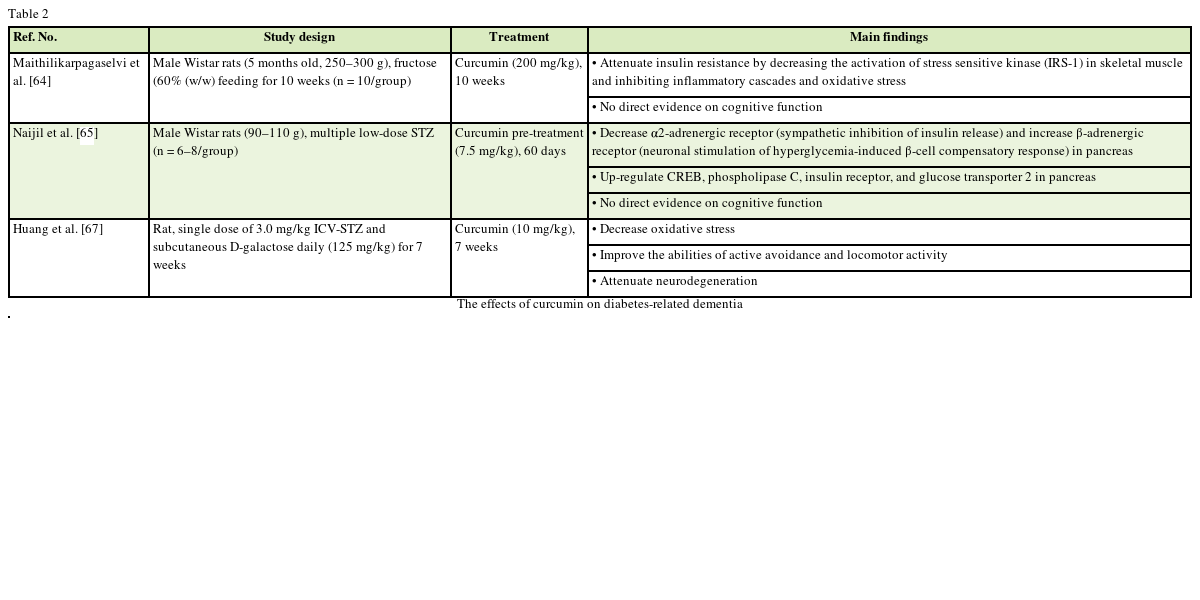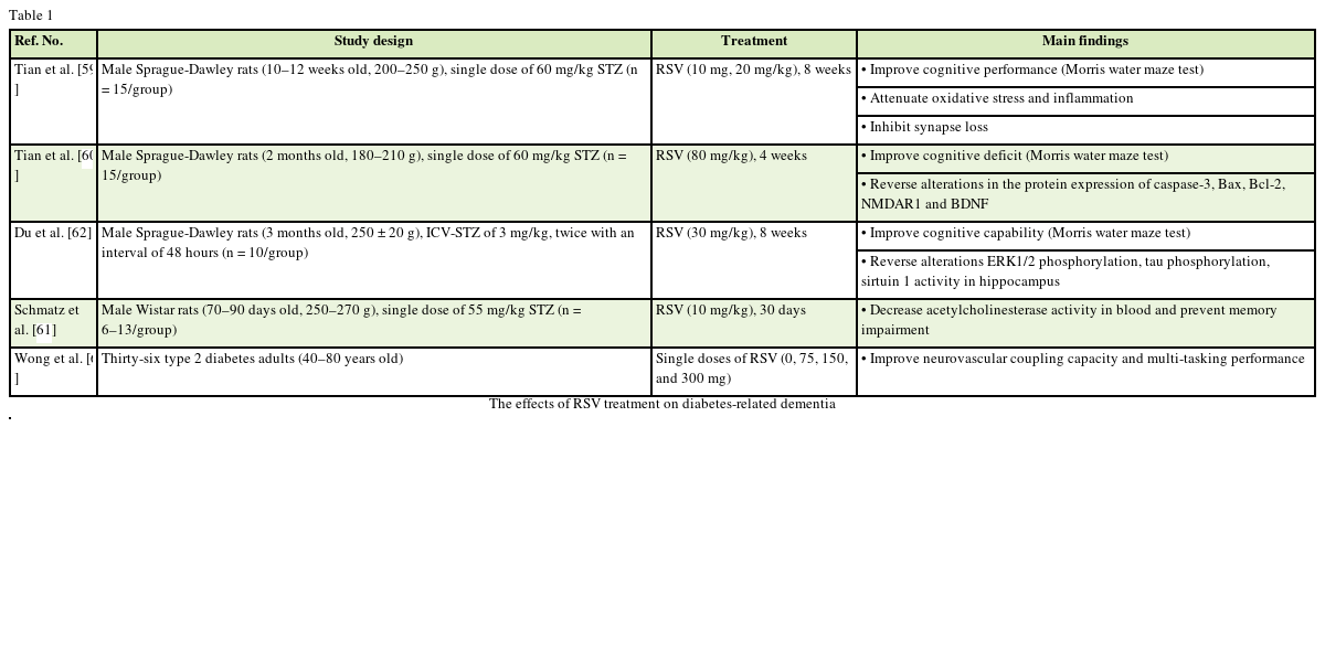 Table 1 summarizes reports regarding effects of resveratrol on diabetes-related dementia in rodents and human. Recent evidence has demonstrated that the neuroprotective effects of resveratrol is by stimulating amyloid beta clearance and protecting the integrity of blood-brain barrier and neuronal structure [