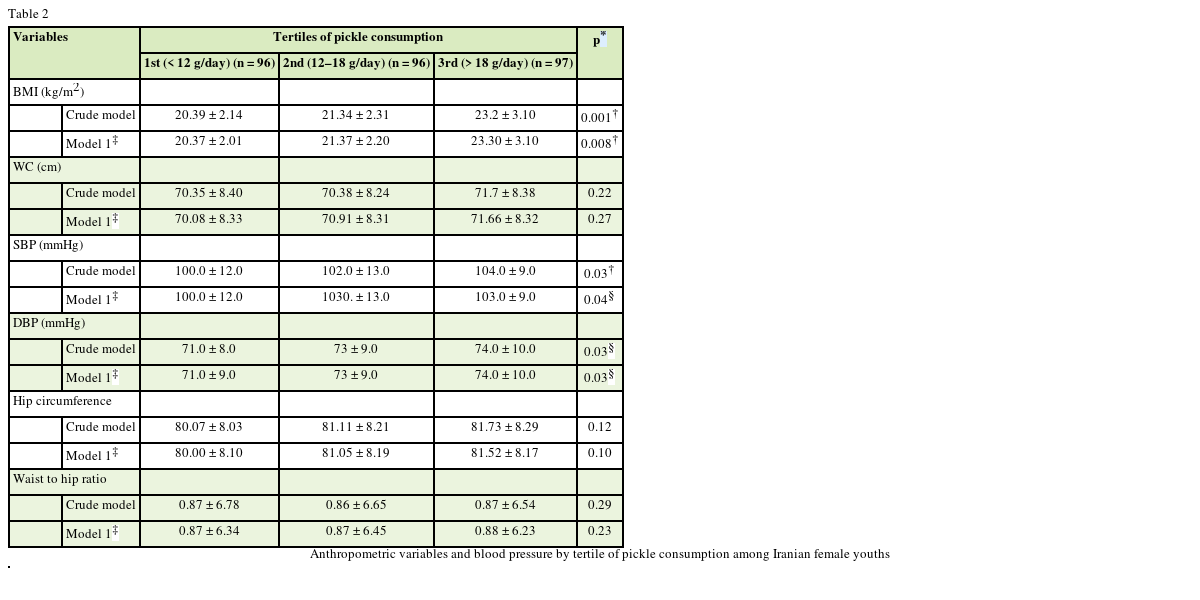 Table 2 Anthropometric variables and blood pressure by tertile of pickle consumption among Iranian female youths