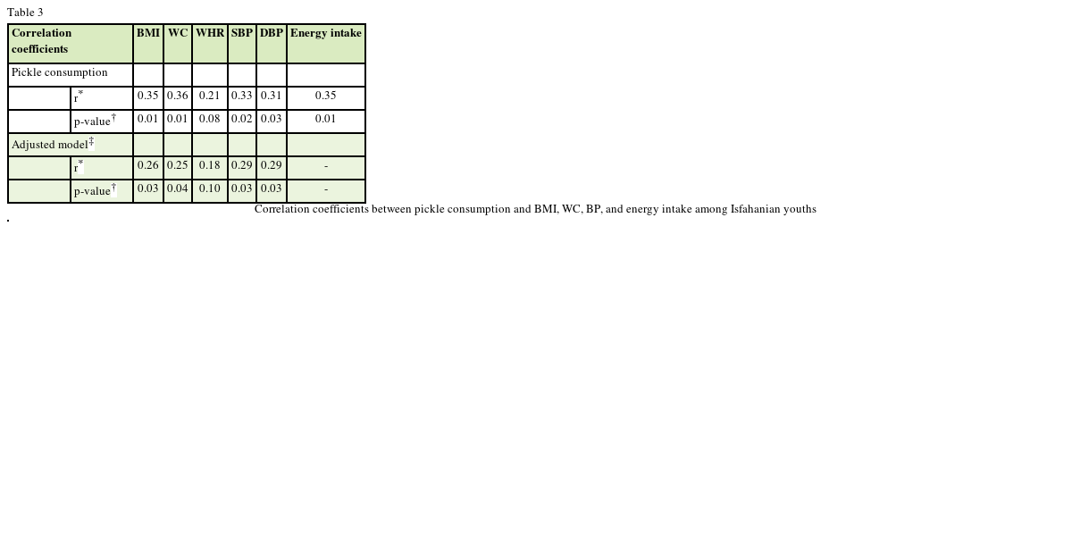 Table 3 Correlation coefficients between pickle consumption and BMI, WC, BP, and energy intake among Isfahanian youths