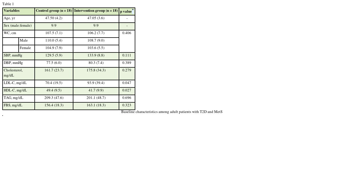 All measurements and indicators of the 2 groups were compared at the baseline and after 8 weeks of intervention to evaluate the impact of the intervention. To compare the changes between the groups, one-way repeated measure analysis of variance was used. Data analysis was performed using statistical package for social sciences (SPSS) version 20 (IBM Corp., Chicago, IL, USA), data base for windows. The level of significance was set at p values < 0.05.