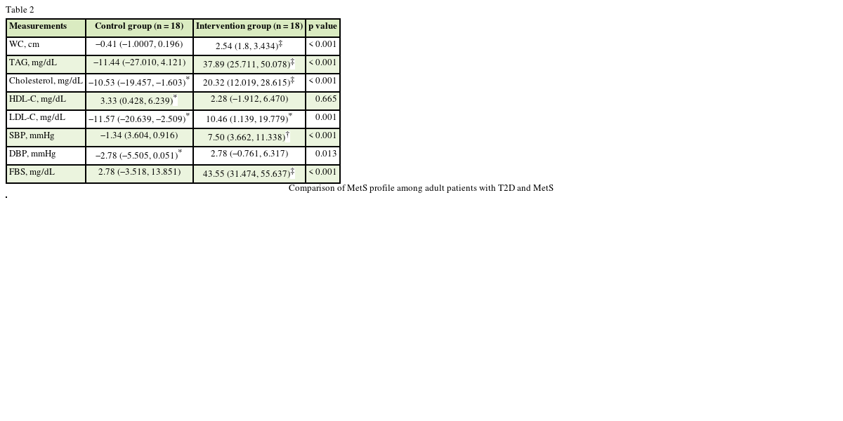 Table 1. The baseline FBS and WC were not significantly different between groups. The mean WC, TAG, and FBS were above normal level in both groups.