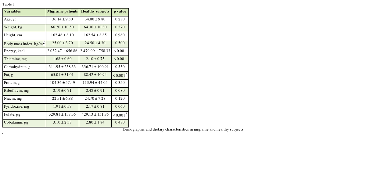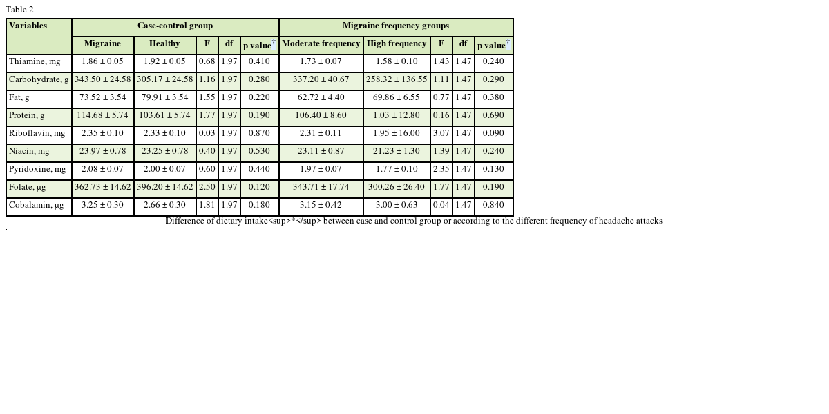 Dietary intake of the energy, thiamine, folate, and fat were significantly lower, among migraine patients than the healthy people (p < 0.001) (