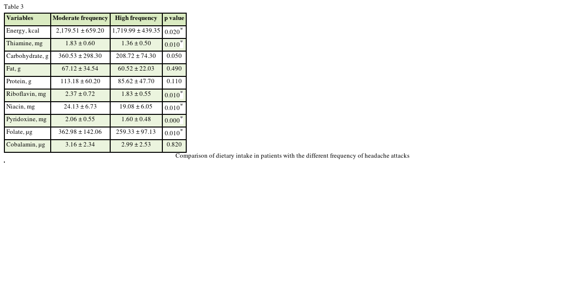 Mean of thiamine intake was significantly different between patients with the moderate and high frequency of migraine attacks. However, the differences was not significant, after adjusting for energy.