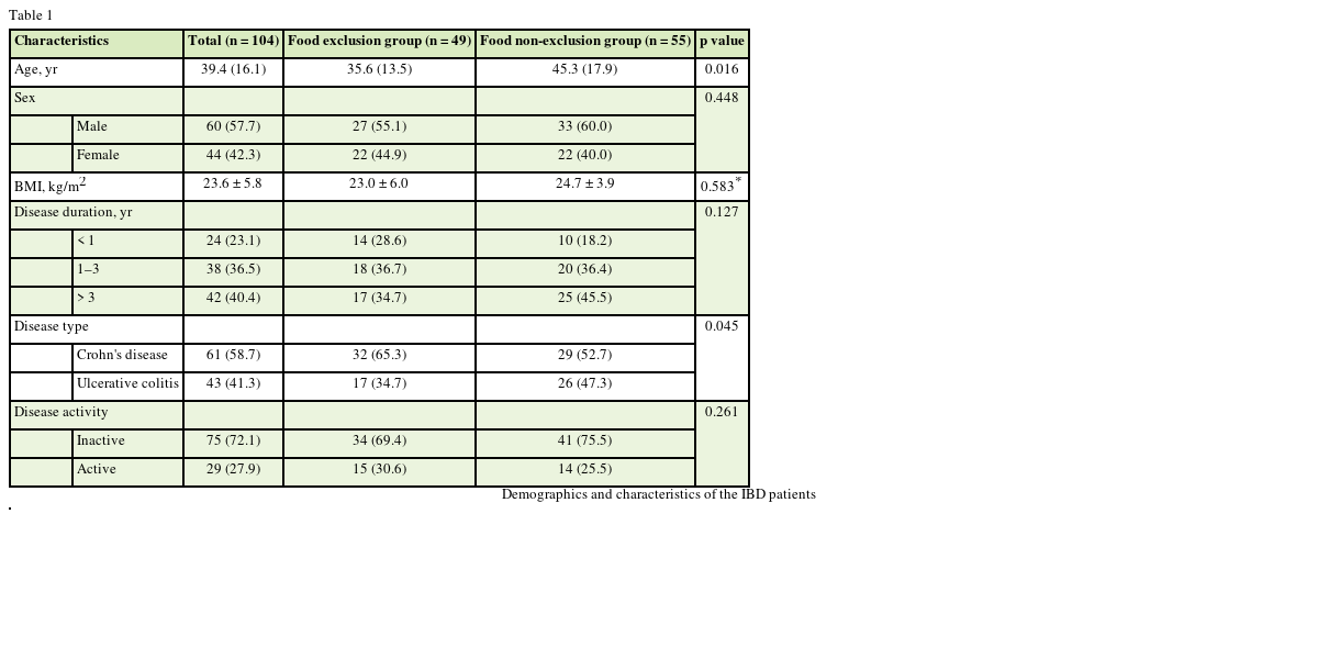 The study subjects were patients with confirmed IBD who visited the digestive division of Soonchunhyang University Hospital in Gyeonggi-do. The first 112 patients participated but only the final 104 results were used for the study; results from 8 patients were excluded due to denial or missing data. The participants were fully informed of the purpose, need, and method of this study and asked for their consent. The research design and protocol were approved by Institutional Review Board of Soonchunhyang University (approval number: 2015-BM-002-01). Based on the study purpose, the subjects were classified into 2 groups (food exclusion group, n = 49; food non-exclusion group, n = 55) through interviews with a clinical dietitian.