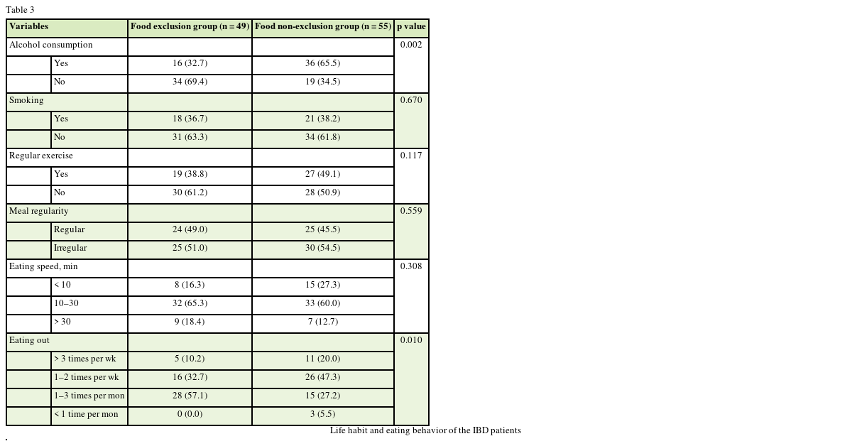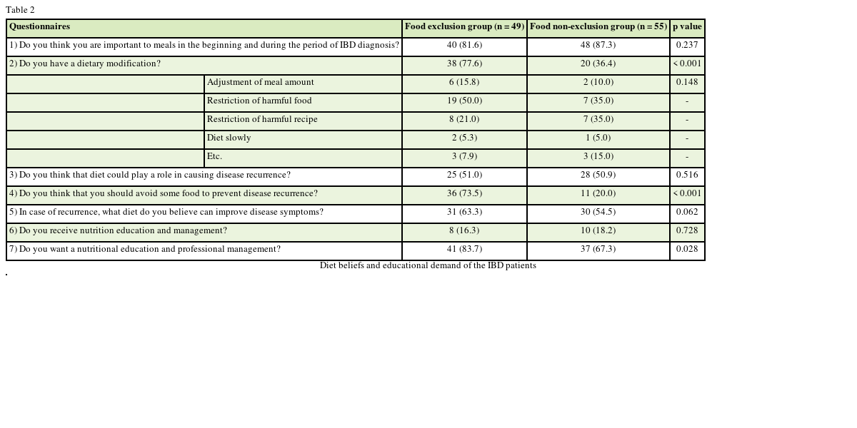 19]. Recent changes in the concept of IBD treatment are not adequate to control patients' beliefs and experiences. Still, there is a concern about an adverse effect of the diet which is based on of patients' prolonged absolute belief. Individualized adjustments are therefore necessary to accommodate the patient's disease and condition. In this study, the food exclusion group had a higher rate of Crohn's disease patients and the belief that food control decreased recurrence of symptoms compared to food non-exclusion group. However, the intake of some nutrients was poor, and the rate of malnutrition was high in patients in the food exclusion group.