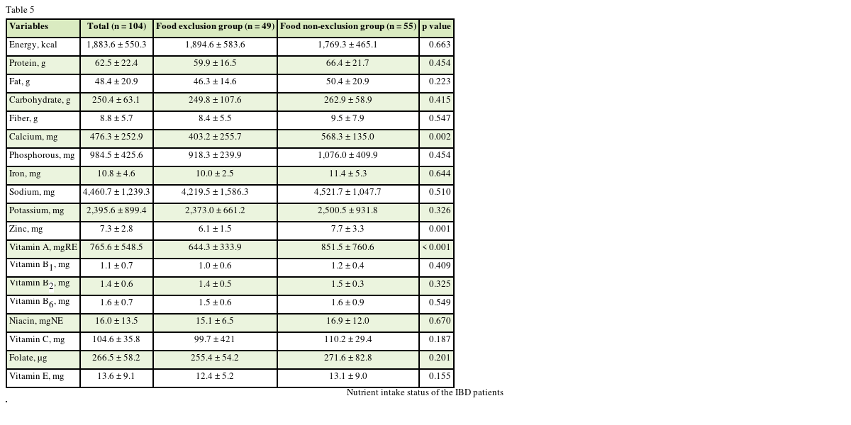 10]. However, nutrition studies conducted for Korean patients with IBD are very rare. This study was performed to assess the nutritional status of patients with IBD and to analyze whether the diet or nutritional imbalance varies depending on food restriction. Our findings will serve basic data to future clinical nutrition research for IBD patients.
