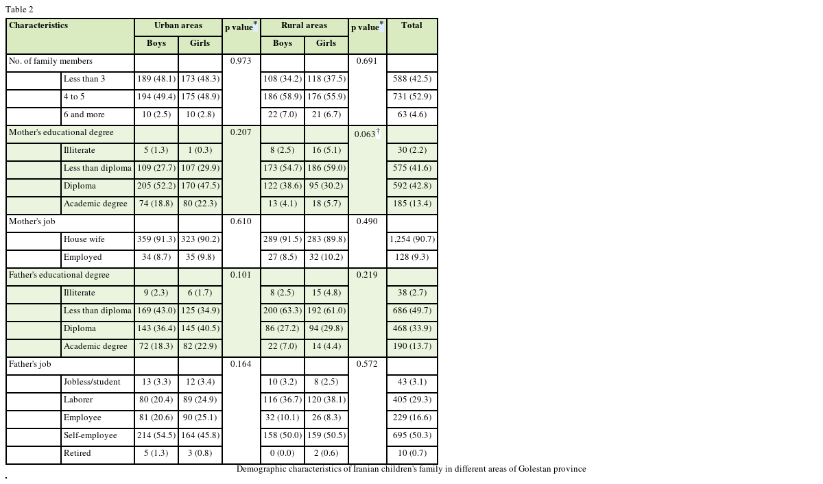 Table 2 Demographic characteristics of Iranian children's family in different areas of Golestan province