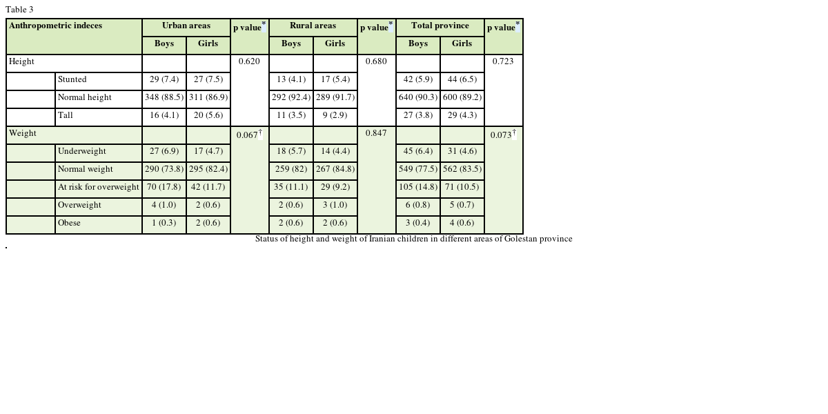 Table 3 Status of height and weight of Iranian children in different areas of Golestan province