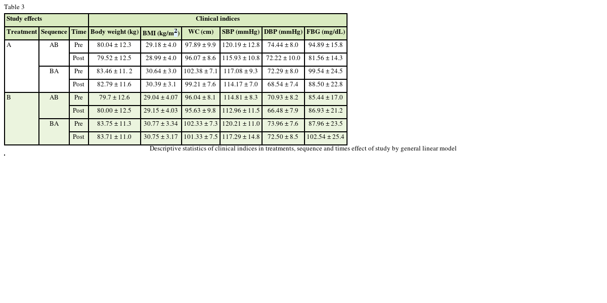 In regard to anthropometry indices (body weight, WC, and BMI), this study did not show any significant change (as treatment effect of study) by