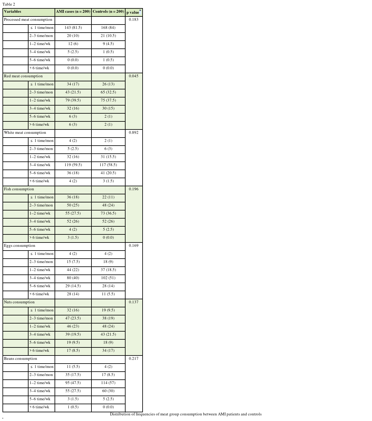 Table 2 Distribution of frequencies of meat group consumption between AMI patients and controls