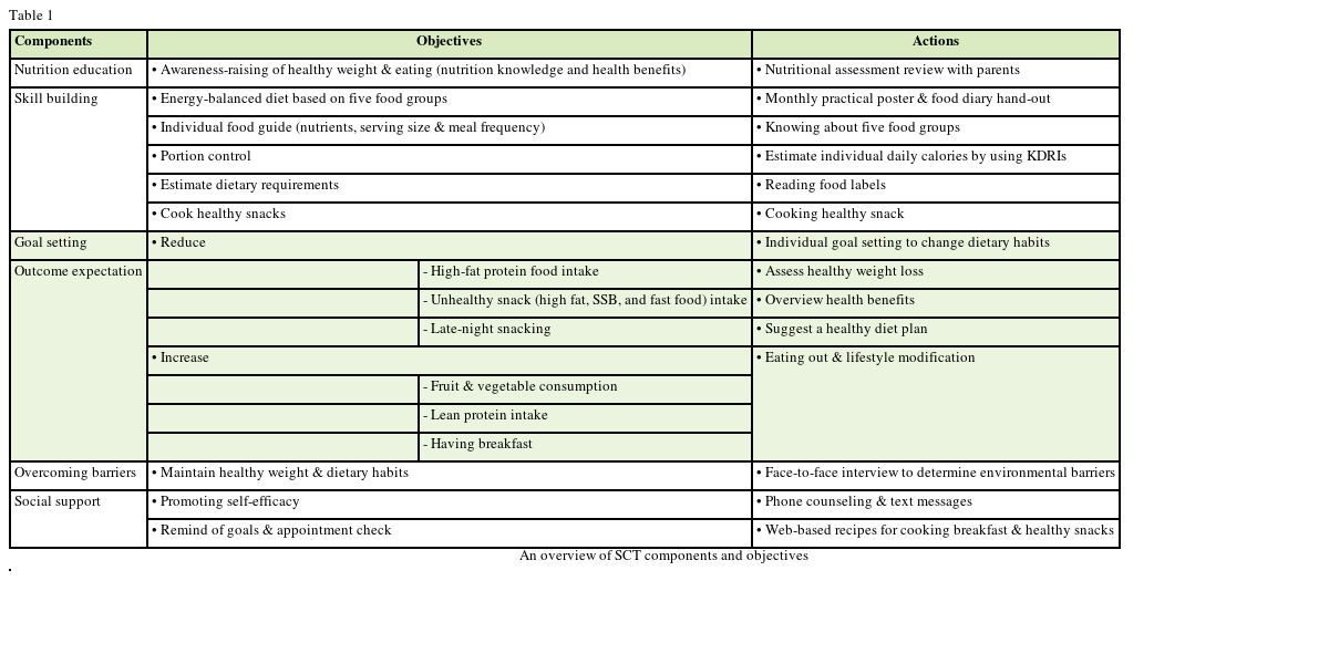 The SCT components and objectives of the nutrition session are described in Table 1. All sessions aimed to provide nutritional knowledge and a practical mission in real life for individual dietary goal setting and self-control. Nutrition education (NE), skill building (SB), goal setting (GS), outcome expectation (OE), overcoming barriers (OB) and social support (SS) were applied to perform the monthly practical missions, individual goal setting to change dietary habits, and to seek environmental barriers in moderate to severe obese children and adolescents (Table 1).