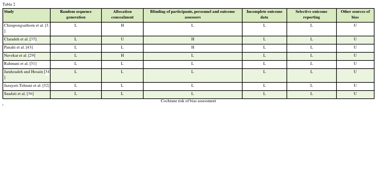 38] was used by two separate investigators (R.G. and S.J.) to evaluate the methodological quality of the papers. This scale comprises of 7 criteria which are as follows: random sequence generation, allocation concealment, blinding, as well as the detection of incomplete outcome data, selective outcome reporting, and other potential sources of bias. Based on the recommendations of the Cochrane Handbook, judgment of each item was recorded as “Low,” “High,” or “Unclear” risk of bias. According to the Cochrane Risk of Bias items, the overall quality of individual study was considered as good (Low for > 2 domains), fair (Low for 2 domains), and weak (Low for < 2 domains). Any disagreement in this section was settled by a third researcher (A.M.).