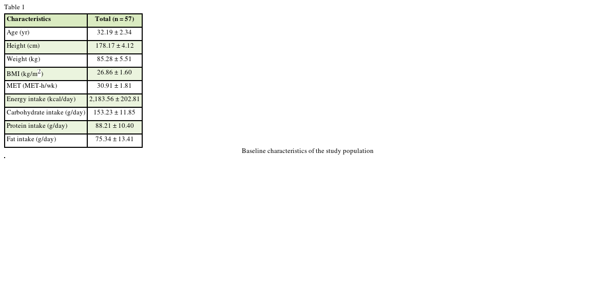 Weight (Bioelectrical Impedance Analysis, Omron BF511; Omron Healthcare, Osaka, Japan) was measured while the participants wore light clothing and no shoes with 0.1-kg accuracy. Also, height was measured with a strip meter for with 0.5-cm accuracy. The BMI was calculated by dividing the body weight (kg) by the height (m