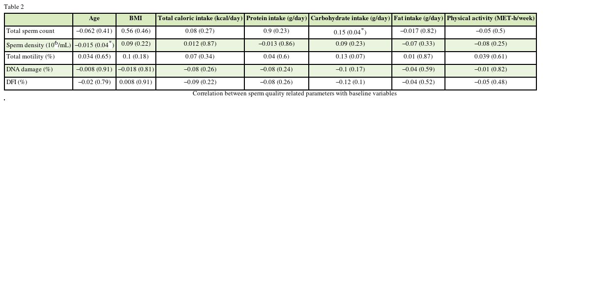 Table 2 has shown the correlation between covariate mean values and some baseline parameters. We found that there was a significant inverse association between age and sperm density (r = −0.015, p = 0.04); also, we observed a linear association between sperm density and carbohydrate intake (r= 0.15, p = 0.04). There were no significant associations between sperm-related parameters with BMI, total caloric, protein, and fat intake and physical activity level (p > 0.05).
