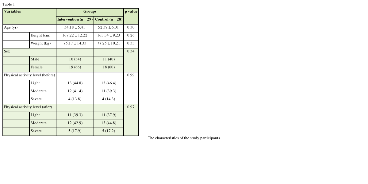 All data were expressed as mean ± standard deviation. Kolmogorov–Smirnov test was used to determine the normality of studied variables. Independent sample t-test was used for comparing the differences in variables between the 2 groups. Within-group, analyses were conducted using paired samples t-test based on a change from baseline. To eliminate the effects of confounding factors, the analysis of covariance (ANCOVA) test was used. All ANCOVA models were adjusted for age, sex, and calorie intake. The p < 0.05 was considered significant.