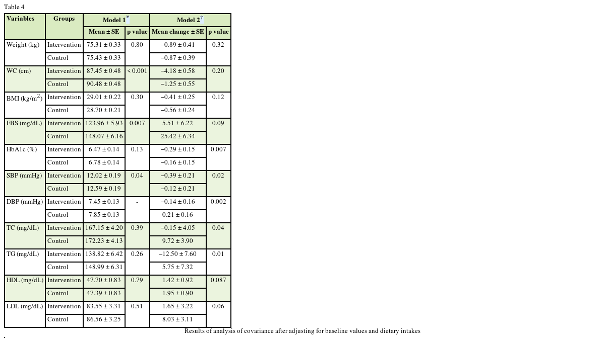 In the current study, both intervention and control group showed a non-significant reduction in the body weight and BMI. In the crude model, intervention group has shown a more reduction in the WC rather than the control group, but, it did not remain significant after adjusting the results for confounding factors, which was contradicted previous findings [