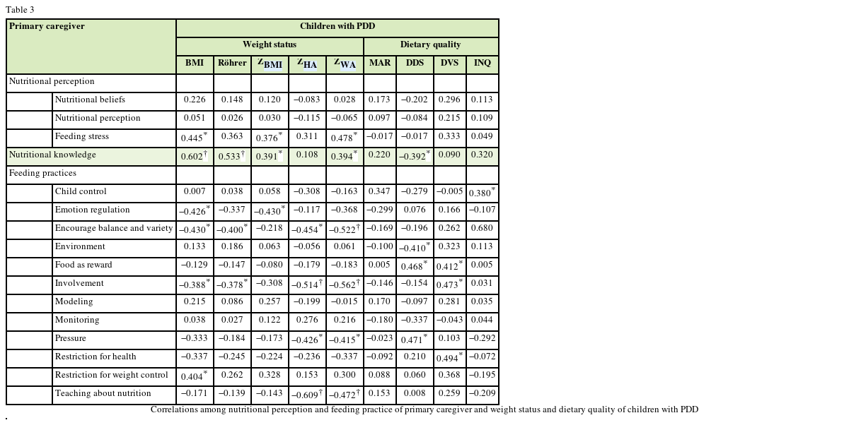 Correlations among nutritional perception and feeding practice of primary caregiver and weight status and dietary quality of children with PDD
