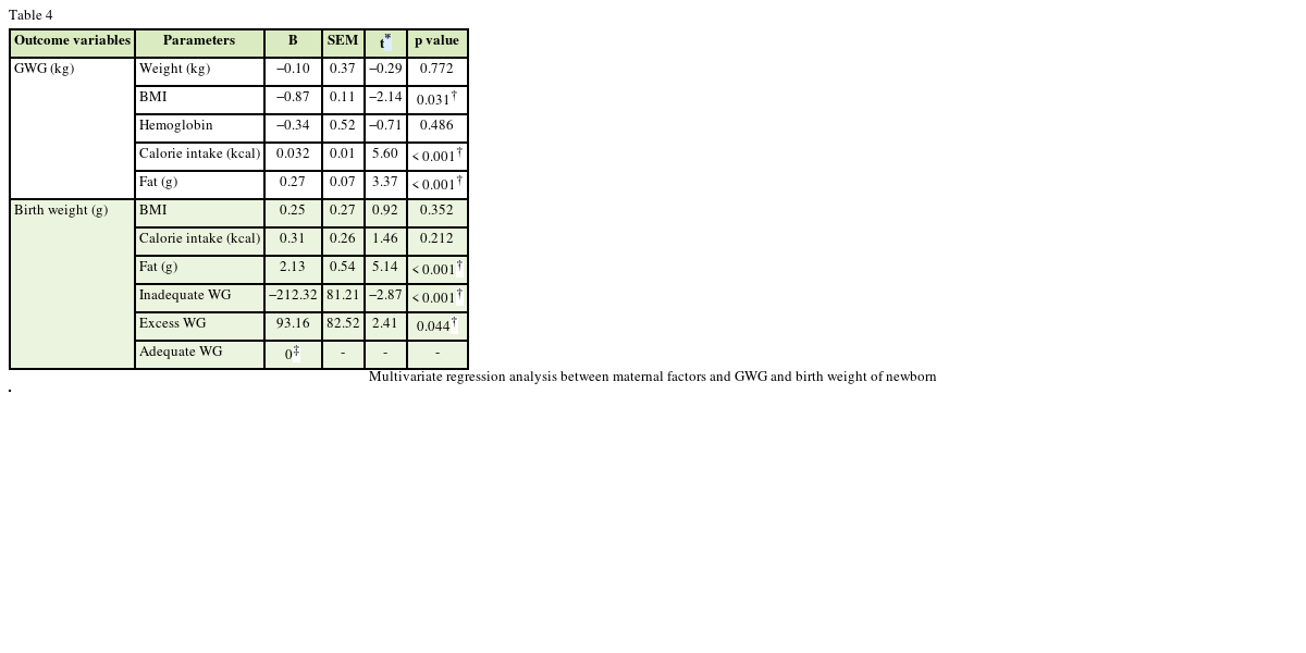 Regression analysis showed that BW of newborns was affected in a significant manner by the amount of fat intake by mother, i.e., 1 g of fat intake was associated with an increase of 2.13 g (p < 0.01) in mean weight of newborns. It was also found that BW was significantly different between women with inadequate weight gain and excess weight gain. The weight was significantly lower (−212.32 g [p < 0.001]) in neonate whose mother had an inadequate weight gain in comparison to infants whose mother had adequate weight gain. On the other hand, the BW was found to be significantly higher (93.16 g [p = 0.04]) in neonates with mother having excess weight gain (