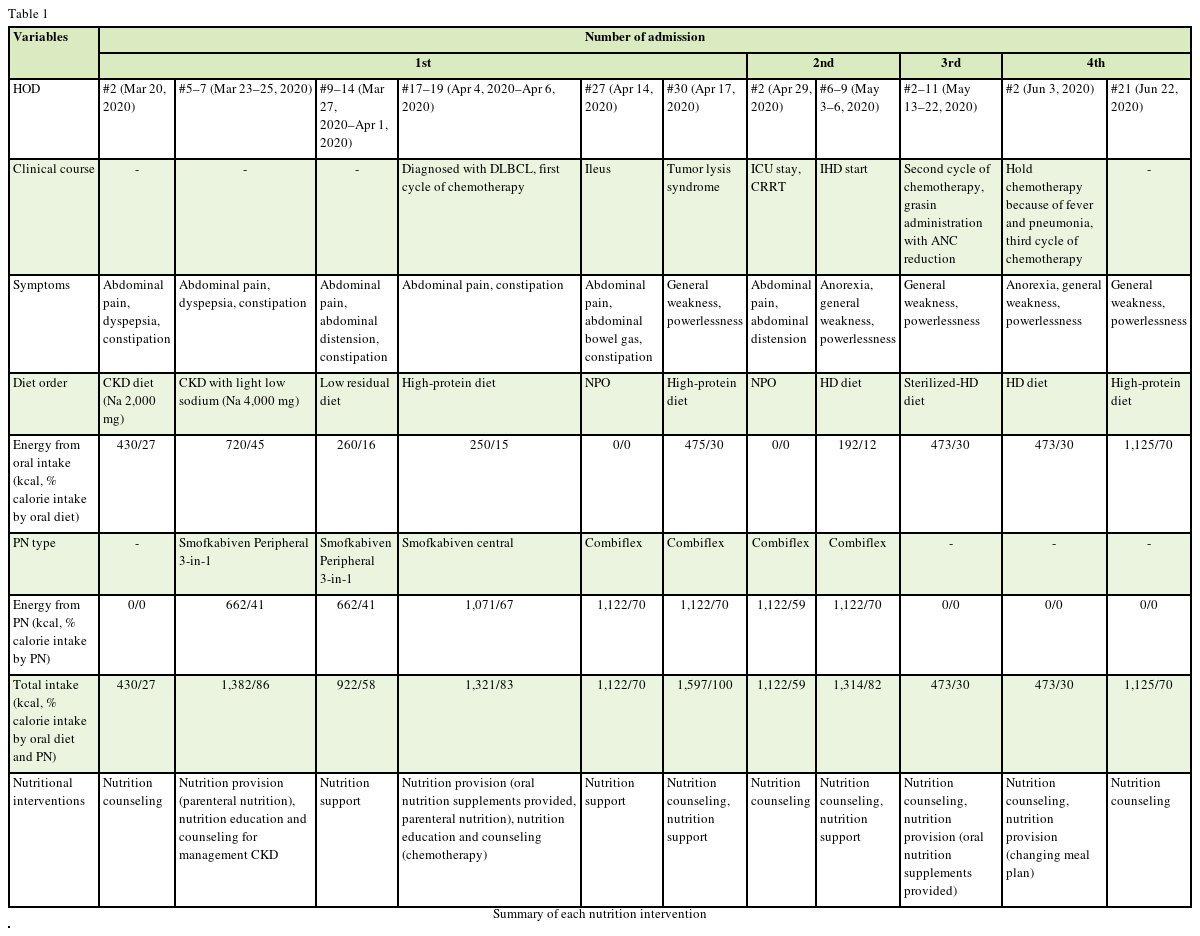 The subject was a 76-year-old male with a history of prostate cancer who is undergoing outpatient treatment at the Department of Nephrology for chronic kidney disease (CKD) due to Autosomal Dominant Polycystic Kidney Disease. He reported abdominal pain on March 19, 2020 and was admitted for further evaluation. The results of a computed tomography scan showed terminal ileum circumferential thickening and terminal ileitis was suspected. Thus, he was transferred to the gastroenterology department on March 26. Results of colonoscopy and biopsy led to the final diagnosis of DLBCL. He was transferred to hematology department on April 2 and started chemotherapy. He was hospitalized a total of 4 times from March 19 to June 23. Three cycles of chemotherapy were performed. Various nutrition intervention processes, such as nutrition education and counseling, nutrition provision (changing meal plans and oral nutritional supplement [ONS]), the explanation about therapeutic diet, and parenteral nutrition (PN) support according to the patient's clinical course during this process are presented in
