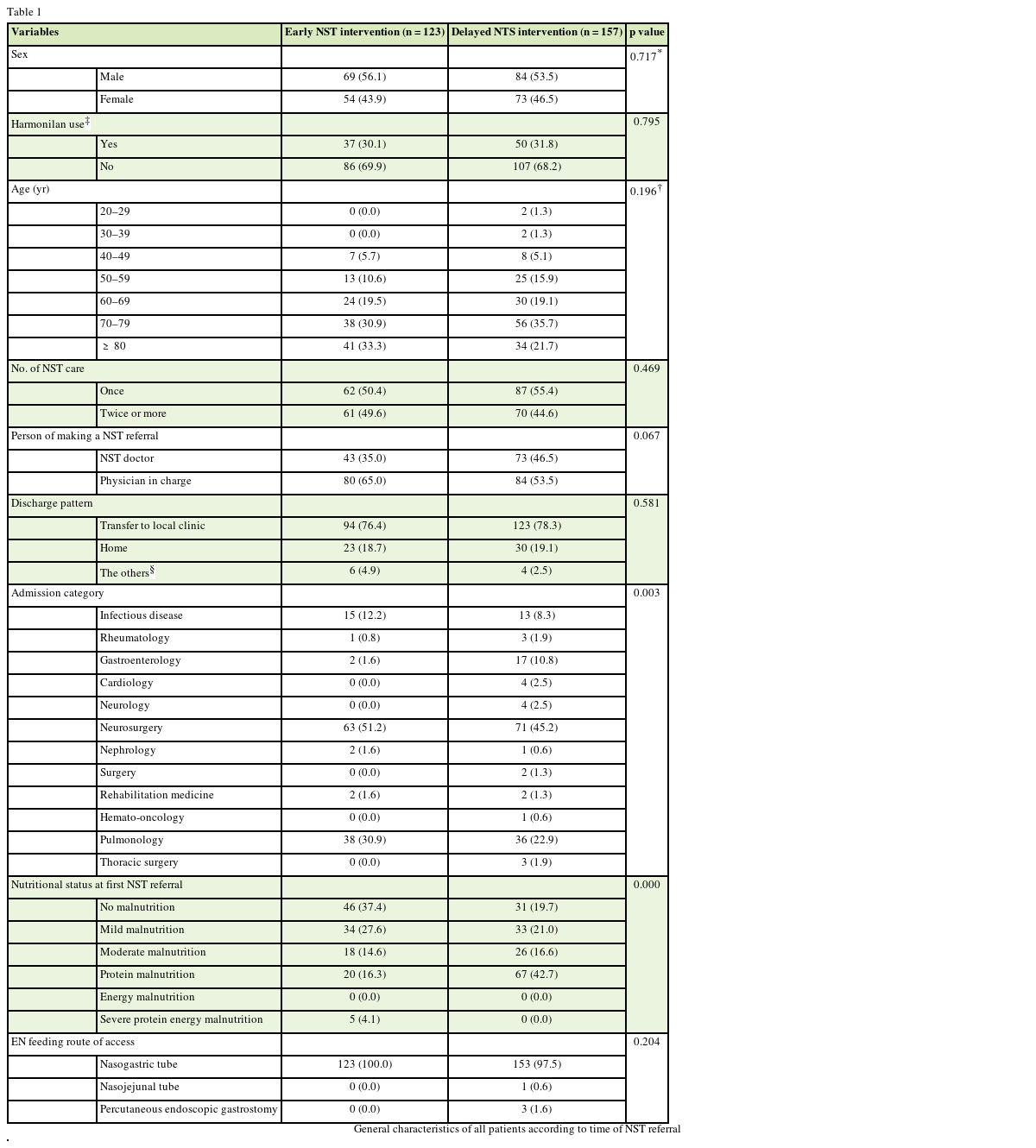 Hence, this study aimed to compare the nutritional status between patients with early and delayed NST supports and to assess the effect of the initiation timing of NST intervention on the nutritional status of hospitalized patients who received EN.