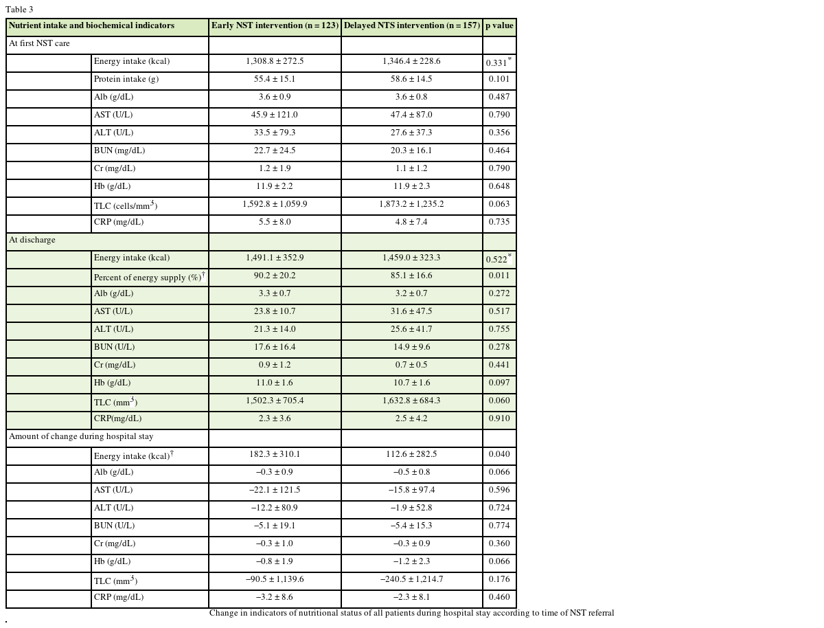 Table 3 Change in indicators of nutritional status of all patients during hospital stay according to time of NST referral