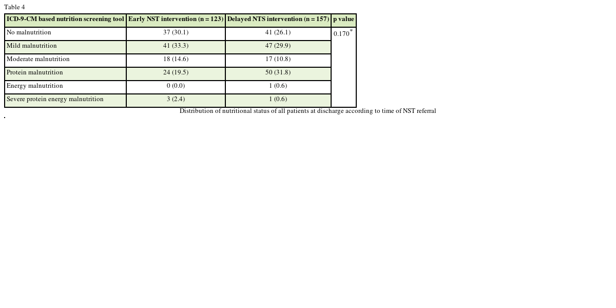 Table 4 Distribution of nutritional status of all patients at discharge according to time of NST referral
