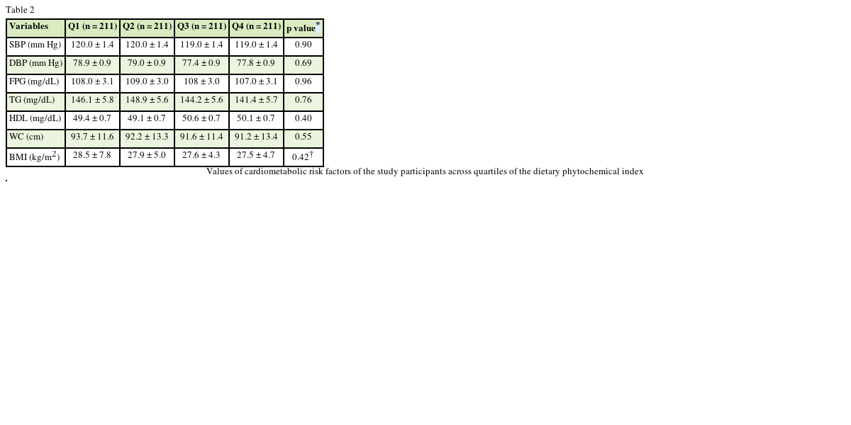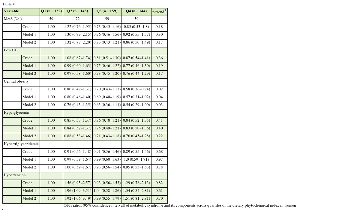 The strength of our study is the relatively large sample size and using a new index that presents the whole dietary phytochemical content. In addition, all information was evaluated with validated questionnaires and was collected by trained nutritionists. However, this study has some limitations. The cross-sectional study design cannot demonstrate causality between DPI and abdominal obesity. Some foods with a high phytochemical amount that do not have energy such as green and black tea were not considered because DPI was developed based on the amount of energy supplied by phytochemicals-rich foods. We did not consider phytochemical subclasses that individuals consumed and therefore, the quality of dietary phytochemicals may be different among participants with similar DPI scores. As a result, it can have different effects on preventing MetS. Despite adjusting for several confounders in our study, the possible effects of residual confounding should be considered.