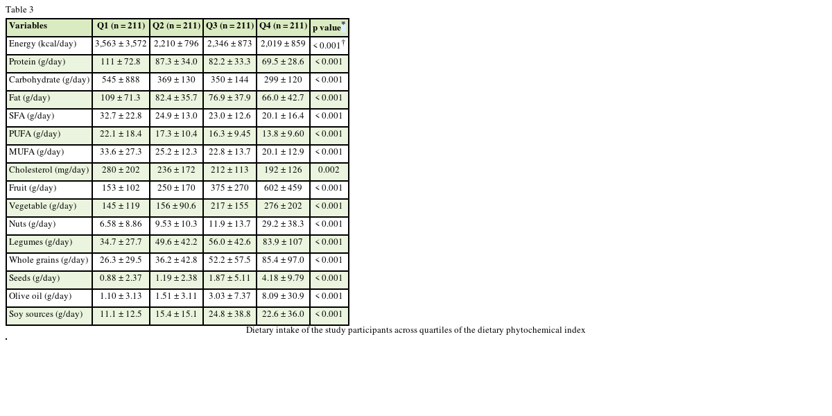 20] introduced a dietary phytochemical index (DPI). This index is defined as the percentage of daily energy intake derived from phytochemical-rich foods. Previous studies showed inverse associations between higher DPI score and chronic disease risks such as MetS, obesity, T2D, cancers, and CVD risk factors [