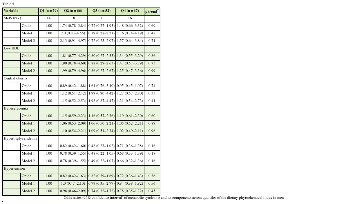 Overall, no significant association was observed between DPI score and odds of MetS in the present study. However, a significant inverse association was found between the consumption of foods rich in phytochemicals and central adiposity in women. There was no significant association between higher DPI score and other components of the MetS. More research, in particular those with prospective nature, is needed to approve the present findings.