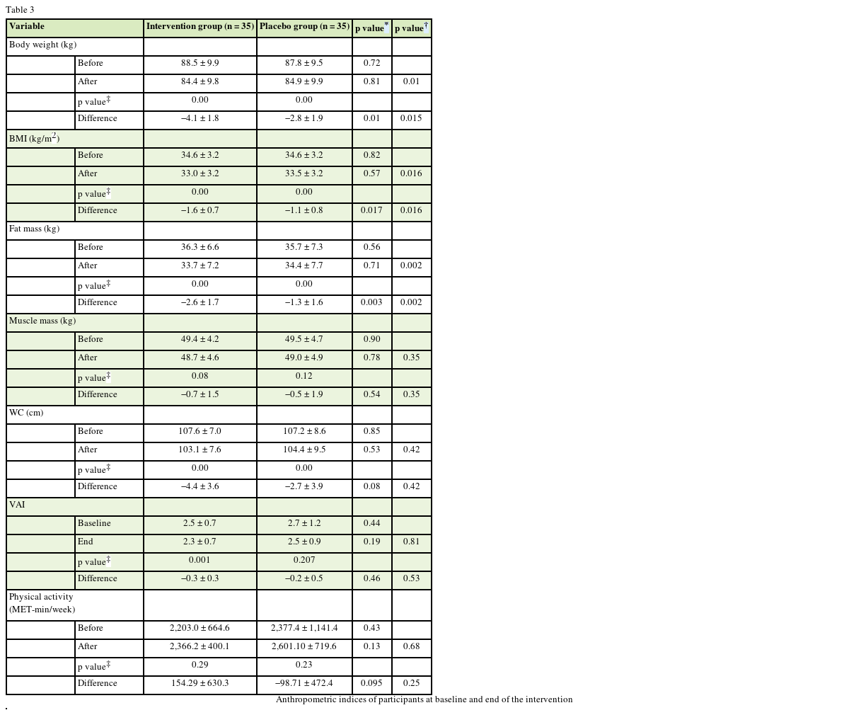 Four participants in the intervention group (three subjects due to noncompliance and one subject due to location change) and three participants in the placebo group (2 subjects due to travel and one subject due to noncompliance), were lost to follow. But, all the statistical analyses were done using the intention-to-treat principle (placebo group, n = 35 and OLE group, n = 35). The study groups were homogenous regarding the baseline age, height, weight, BMI, WC, married status, and physical activity levels (p > 0.05) (