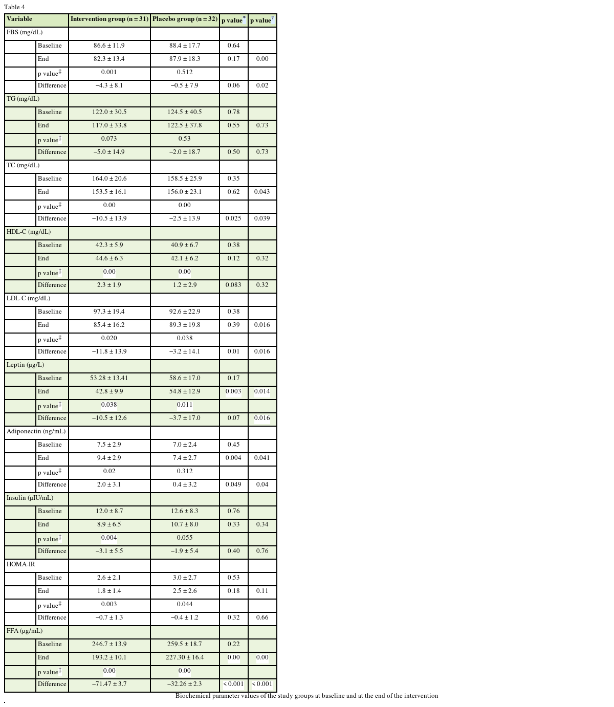 48] described that consumption of OLE (one tablet of 500 mg/day) for 14 weeks resulted in improvement in fasting serum levels of insulin and HbA1c in type 2 diabetes mellitus patients. In the study of Wainstein, the supplementation dose and duration of intervention were higher. But in the present study, it seems that the weight loss diet could help supplementation in improving metabolic parameters. In another study, supplementation with OLE demonstrated a 28% improvement in pancreatic B-cell responsiveness and a 15% improvement in insulin sensitivity in middle-aged overweight men [