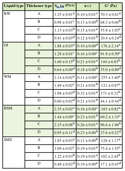 Table 3 Magnitudes of apparent viscosity (ηa,50) and flow behavior index (n) of thickened liquids prepared with different thickeners to achieve a pudding-like thickness