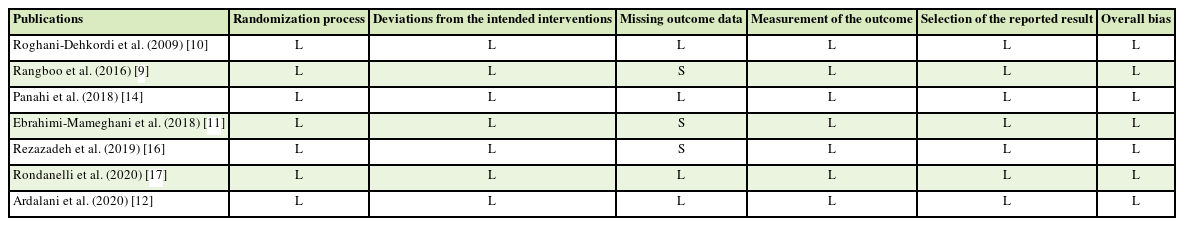 The quality of studies was assessed for risk of bias by using the Revised Cochrane risk-of-bias tool (RoB 2) [23]. The following methodological domains were considered: (1) random sequence generation, (2) allocation concealment, (3) blinding of participants and personnel, (4) blinding of outcome assessment, (5) incomplete outcome data, (6) selective reporting, and (7) other potential threats to validity. According to Cochrane Handbook recommendation, studies were stratified as low risk of bias; high risk of bias, and some concerns (Table 1).