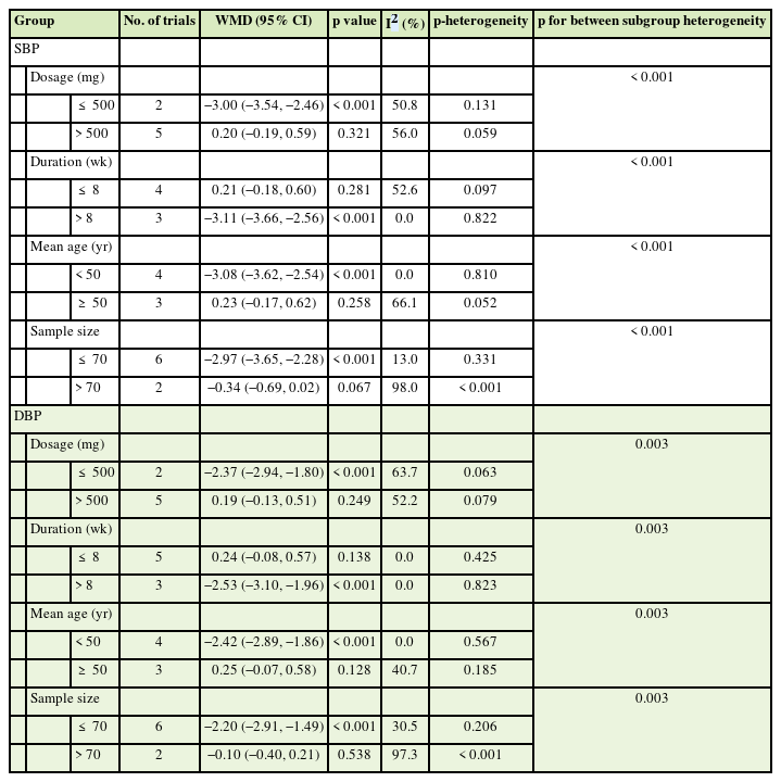 Subgroup analysis of included randomized controlled trials in meta-analysis of the effect of artichoke supplementation on blood pressure